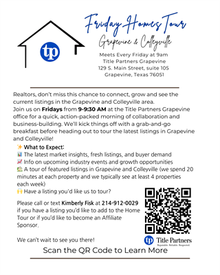 Join us on Fridays from 9-9:30 AM at the Title Partners Grapevine office for a quick, action-packed morning of collaboration and business-building. We?ll kick things off with a grab-and-go breakfast before heading out to tour the latest listings in Grapevine and Colleyville!
